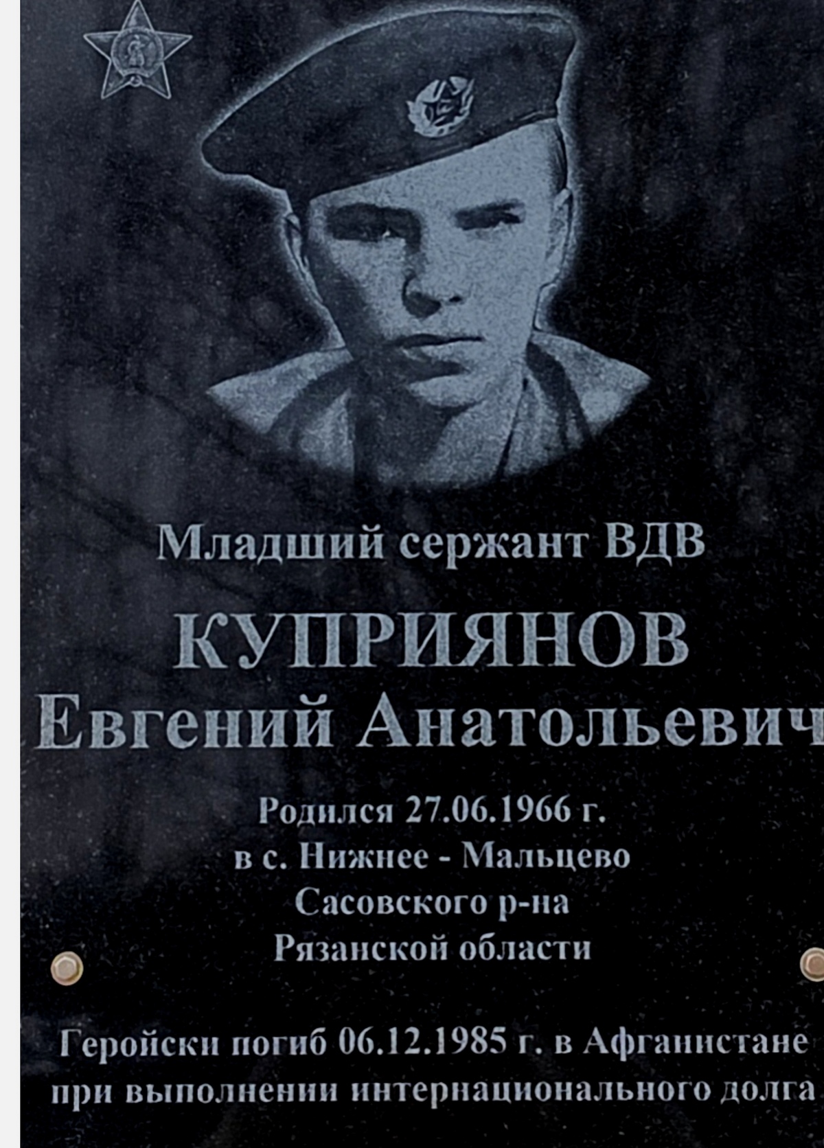 13 февраля в селе Нижнее Мальцево торжественно открыли мемориальную доску земляку, воину, выполнявшему интернациональный долг в Афганистане, младшему сержанту Евгению Куприянову.