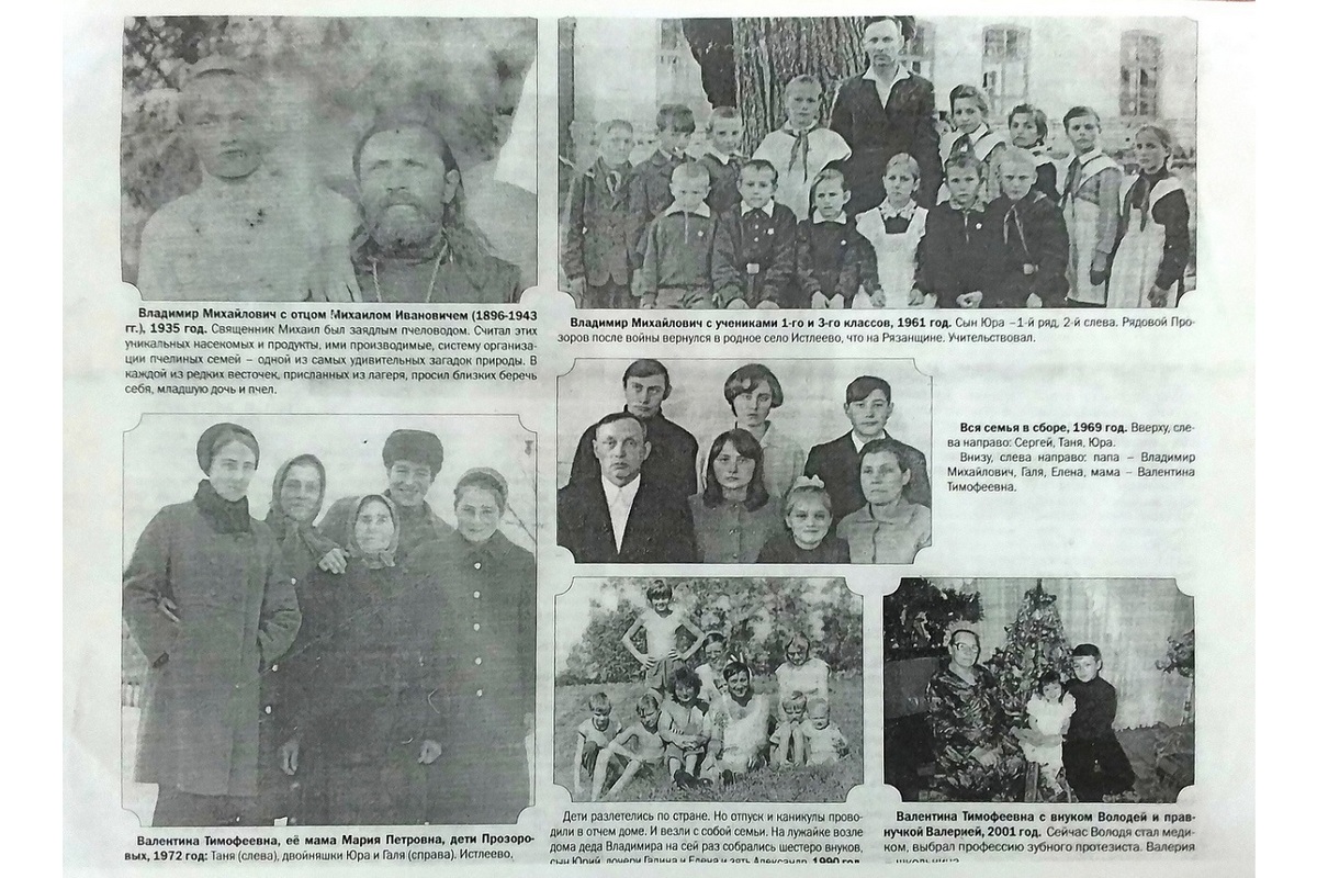 «Батюшку репрессировали в 1937 году, и он умер от голода в лагерях Удмуртии. Мы читали его письма, от руки переписанные внучкой батюшки и подаренными нашей библиотеке много лет назад. Она привезла фотографии и копии газетных статей о семье и потомках священника. Его сын, Владимир Михайлович Прозоров, прошел всю Великую Отечественную войну от Москвы до Берлина, а потом всю жизнь посвятил работе учителя словесности в родном селе. Как раз в те годы и был найден в подполе школы образ Божией Матери «Иверская». Сейчас эта святыня находится в храме Успения села Огарево-Почково».