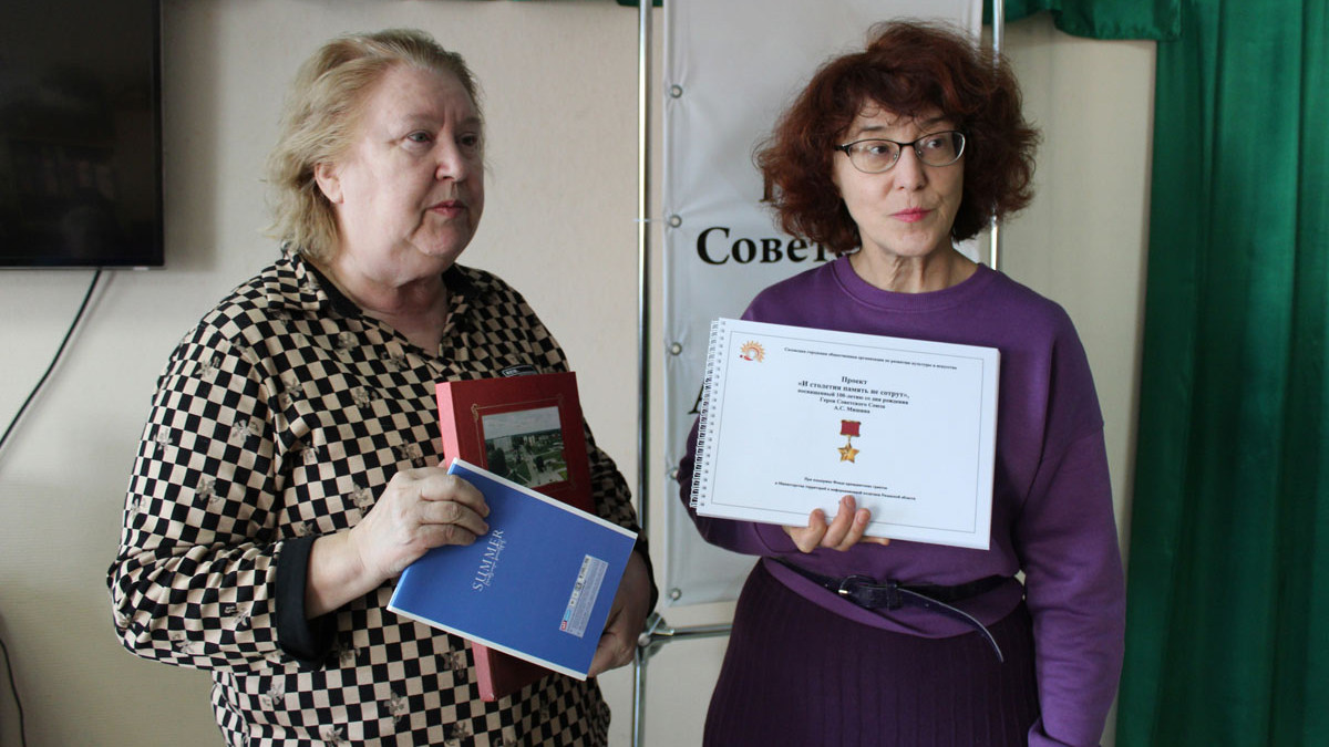 Татьяна Панфёрова, член инициативной группы, руководитель проекта, председатель центра добровольческой помощи города, вручила альбомы о Герое Советского Союза и дипломы: директору центральной библиотеки Ларисе Бабановой, заведующей центральной детской библиотекой Нине Крыловой.