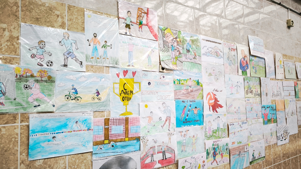 Как рассказала методист спортивной школы «Планета спорта» Екатерина Зайцева, в первую очередь оформили выставку рисунков «Мы с папой выбираем спорт!».